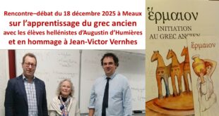 Par Laurent Caillot et Charmiane Frey Sources : sites internet de la Ville de Meaux et du Lycée Jean Vilar A l’invitation d’Augustin d’Humières, nous nous sommes rendus le 18 décembre 2025 au lycée Jean Vilar de Meaux (Seine-et-Marne) pour une rencontre originale avec ses élèves de grec ancien, et pour une partie également de latin, consacrée …