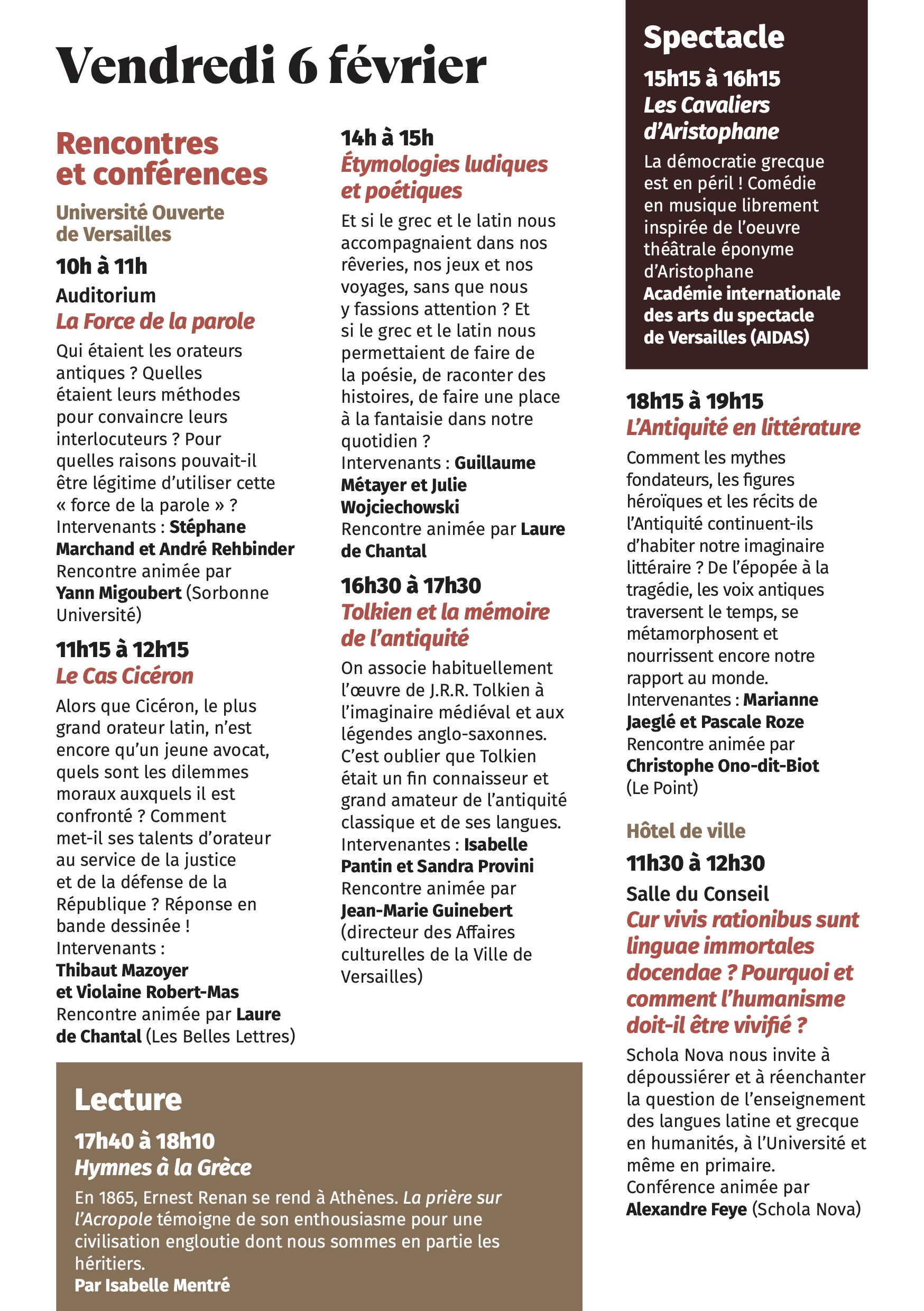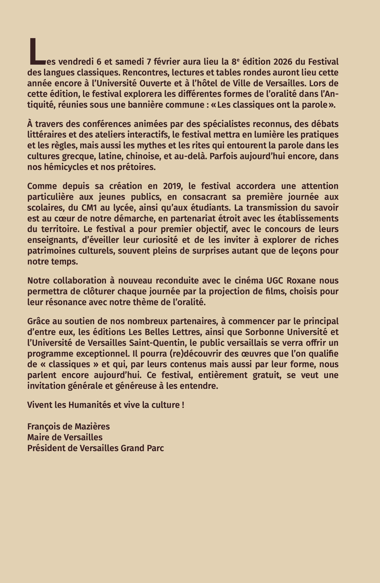 En effet, comme chaque année depuis la première édition en 2019, l’association « Arrête Ton Char ! » participera à la 8ème édition du Festival des Langues Classiques de Versailles, le samedi 7 février 2026, toute la journée.