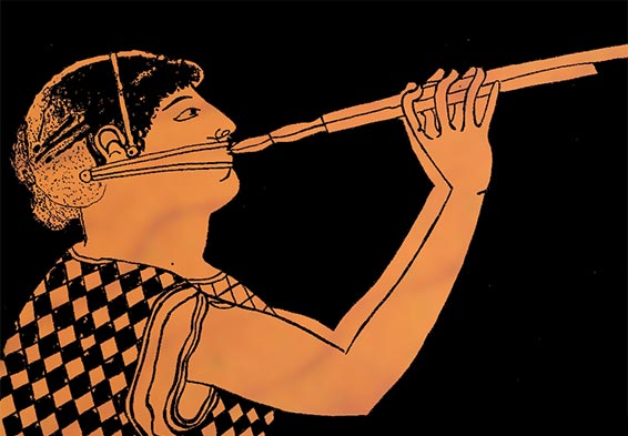 Dans le monde grec, la musique était très présente dans les sphères de la vie privée ou publique. On entendait de la musique au théâtre bien sûr ou dans les banquets mais aussi au gymnase, sur les fameuses trières pour donner la cadence aux rameurs (contrairement à ce que laissent croire les péplums mettant en scène des tambours), également dans les rangs de l’armée ou sur l’agora.