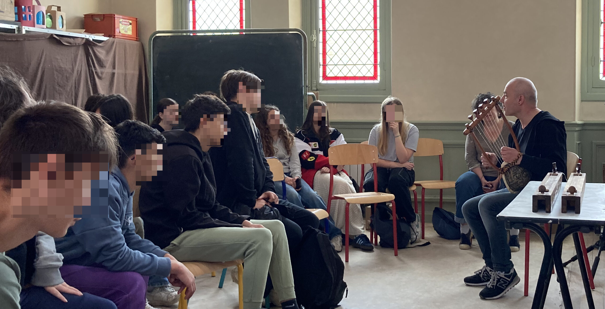 Effectivement, au sein du projet Ougarit nous proposons des ateliers adaptés à différents publics. Il s’agit de faire découvrir de façon ludique, et en contextualisant, la place de la musique pendant cette période fascinante. Qui a inventé la lyre ? D’où viennent les notes ? Les participants peuvent expérimenter des reproductions d’instruments comme la phorminx des aèdes, la lyre, la pandura, et bien d’autres. On pratique différents rythmes comme le fameux Péan d’Apollon. On s’initie également à la hauteur des notes avec le monocorde de Pythagore ou à la notation avec l’alphabet grec. Pour les scolaires, des ateliers plus spécifiques peuvent être proposées aux enseignants en fonction de leurs programmes. Depuis 2021, nous sommes intervenus dans 41 lieux, en majorité en Occitanie mais aussi dans d’autres régions (Forum antique de Bavay dans le Nord, Villa Kérylos dans les Alpes-Maritimes, Musée de Jublains dans la Mayenne, Musée de Champollion à Vif dans l’Isère) (cf. « Nos références » sur le site internet Ougarit).