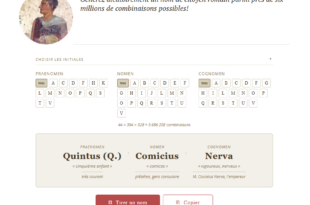 GÉNÉRATEUR DE NOMS ROMAINS : UNE NOUVELLE VERSION Un praenomen, un nomen, un cognomen — c’est ainsi que se construisait l’identité d’un citoyen romain. Le « générateur de noms romains » de l’Association Nunc est bibendum, conçu dans un objectif pédagogique, vient d’être entièrement repensé : 44 praenomina, 394 nomina, 328 cognomina, soit plus de 5,5 millions de combinaisons possibles. Pour chaque …