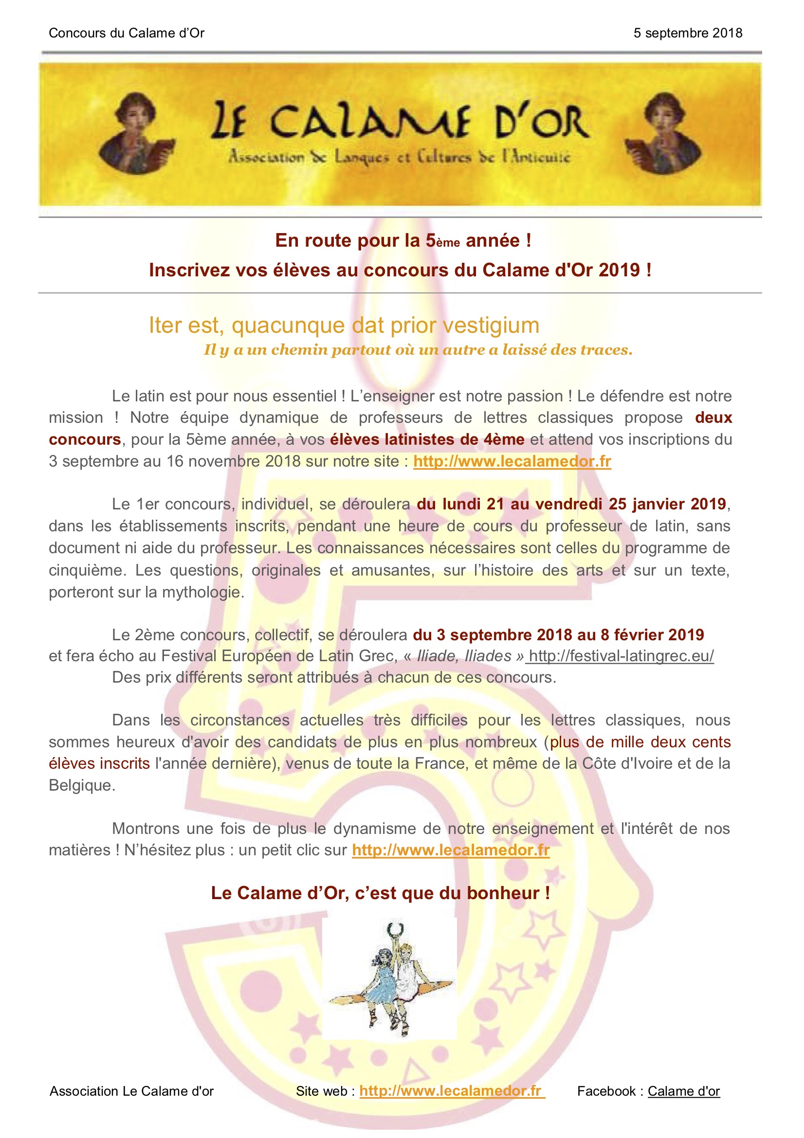 Nos amis de l’association Le Calame d’or lance la 5ème édition de leur concours annuel à destination des élèves latinistes de 4ème.