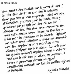 “Pour Arrête ton char, je suis allée à la rencontre d’Angélique Nouvel, agrégée de lettres classiques, qui enseigne le français, le latin et le grec à Marseille, et connue sur Instagram en tant que ad_astra_latin_grec. Aujourd’hui, elle nous présente le premier volet d’une trilogie troyenne, La dernière reine de Troie, Petit Grec paru chez La Vie des Classiques.