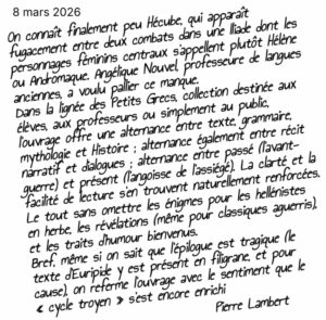 A.N. : Les événements racontés ne sont connus que de Priam car c’est à lui qu’ils sont arrivés. C’est le dernier témoin encore en vie. Mais il est parti défendre sa cité (et mourir sous les coups de Néoptolème) et c’est logiquement Hécube qui prend en charge la narration. J’aimais aussi l’idée de la vieille femme conteuse qui peut renvoyer le lecteur à une grand-mère qui raconte, qui transmet les histoires, qui est passeuse d’histoires entre les générations. Elle tisse comme les Moires le destin de ces hommes. Enfin, j’ai essayé, par ce choix, de rendre hommage à l’Hécube d’Euripide.