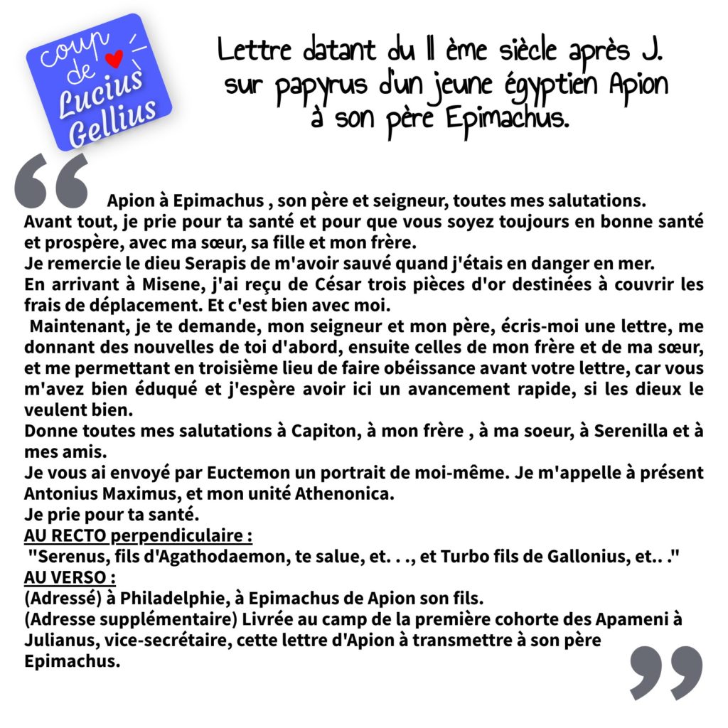 Yann Le Bohec : Le soldat dit à ses parents qu’il les aime, qu’ils lui manquent. Il leur adresse mille souhaits et il n’oublie jamais (ou presque) de leur demander un peu d’argent. Les soldats aimaient leur femme et leurs enfants ; et les rejetons, comme les épouses, aimaient leur soldat de père. De nombreuses inscriptions le prouvent. Bien sûr, ceux qui ne s’aimaient pas ne le disaient pas.