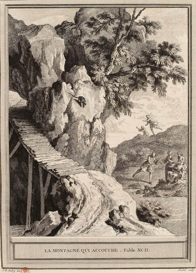 La locution proverbiale parturient montes, nascetur ridiculus mus, apparaît donc en réalité comme un apologue abrégé. Et cela apparaît clairement quand on lit ces extraits de Rabelais ou de La Fontaine. En effet, Rabelais, le premier, s’est inspiré de ce vers d’Horace dans Le Tiers Livre (XXIV) :