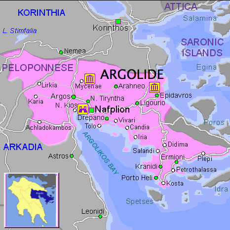 – Le nome d´Argolide est une péninsule bordée au nord par le golf Saronique, au sud par le golf Argolique. Elle s´étend au Nord-Est du Péloponnèse, au sud du nome de Corinthie. Son chef-lieu actuel est Nauplie.