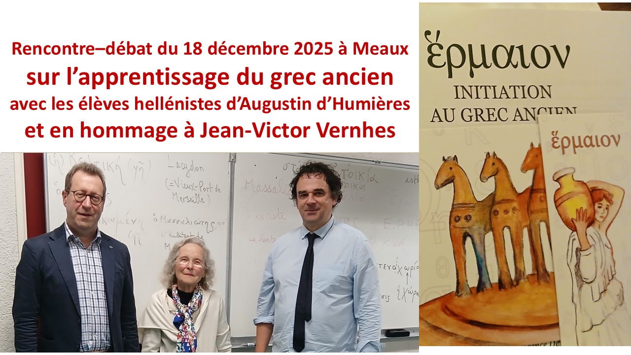 Rencontre-débat du 18 décembre 2025 en hommage à Jean-Victor Vernhes sur l’apprentissage et la pratique du grec ancien avec les élèves d’Augustin d’Humières, Professeur de lettres classiques au Lycée Jean Vilar de Meaux 23 janvier 2026 Par Laurent Caillot et Charmiane Frey Sources : sites internet de la Ville de Meaux et du Lycée… |