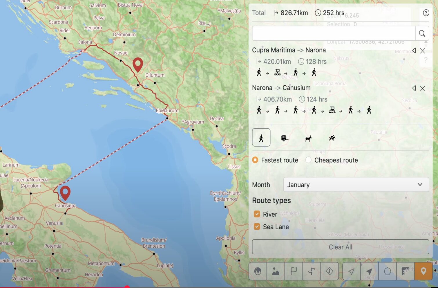 Visualiser le maillage routier antique, calculer un trajet, comme dans l'Antiquité, à pied, en âne, en charrette ou à cheval…