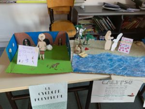 Par groupes mixtes primaires/collégiens , les élèves ont représenté sous forme de maquette chaque épisode de l’Odyssée et ont rédigé un petit résumé des épisodes.