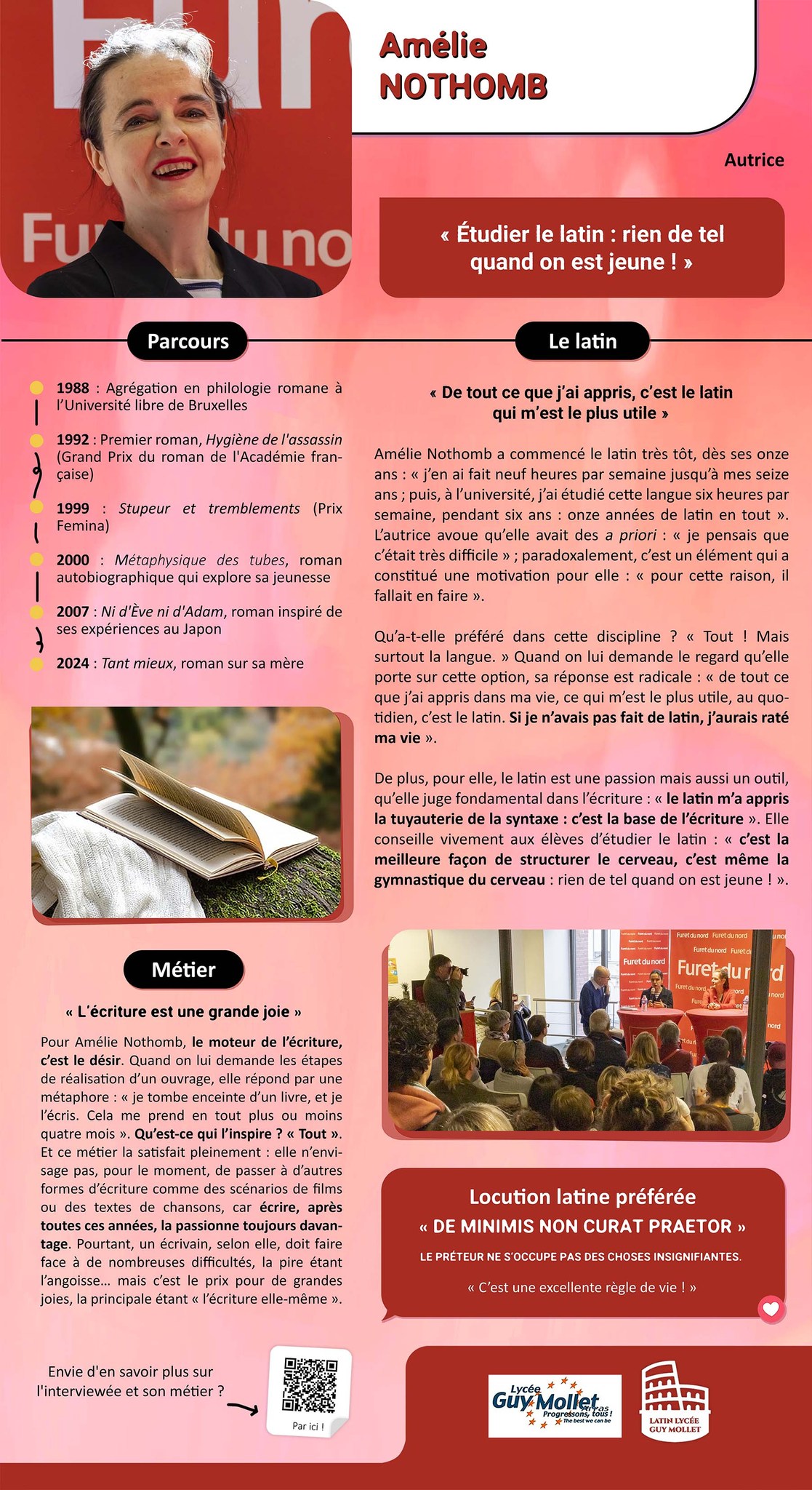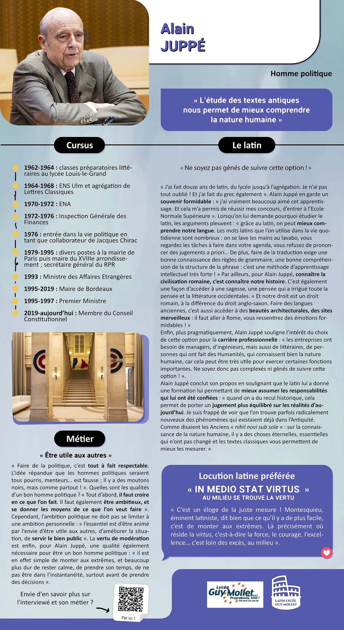 Grâce aux élèves du lycée Guy Mollet, allons à la rencontre de personnalités qui ont toutes en commun d’avoir fait du latin. Interrogées sur leur métier, leur parcours et l’apport du latin dans leurs vies professionnelle comme personnelle, leur message se résume en une image : “le latin comme tremplin” _ titre que les élèves ont gardé pour l’exposition des affiches retraçant ces différentes interviews.